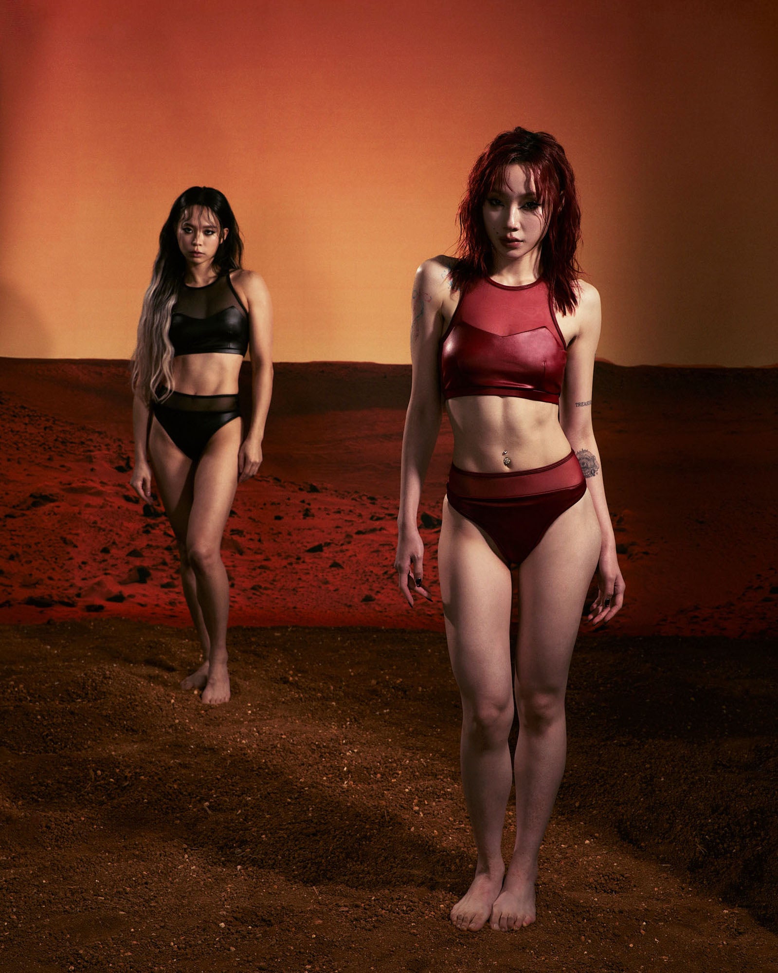 選用高彈性運動機能面料,在動作延展與包覆穩定之間取得平衡;表層透過仿金屬皮革光澤染色工藝,在光線下呈現低調卻充滿力量感的質地,兼具舞台感與實穿度。